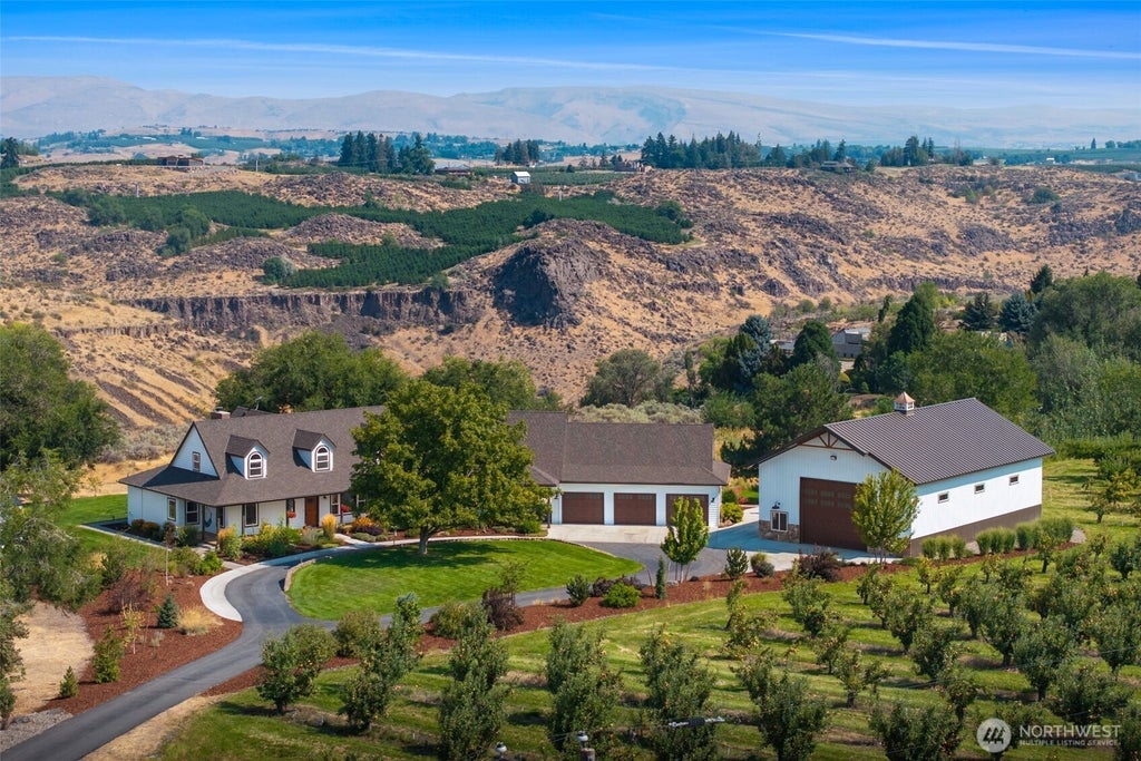 Set on nearly 8.09 acres overlooking Cowiche Canyon, this approx. 4,110 sq. ft. two-story home blends Cape Cod charm with modern farmhouse comfort. A wraparound porch, circle driveway, and manicured landscaping create timeless curb appeal, while apple orchards and natural vegetation surround the property. Inside, hard wood floors flow throughout with custom built-ins, formal and informal living areas, and a kitchen featuring quartz countertops, stainless steel appliances, island gas range, and double oven. The main-level primary suite includes a spa-like bath, while upstairs offers 3 bedrooms and a large bonus room. Outdoor highlights include a pergola-covered patio w/ hot tub, 36’ x 58’ shop with power, and 3-car garage with breezeway.
