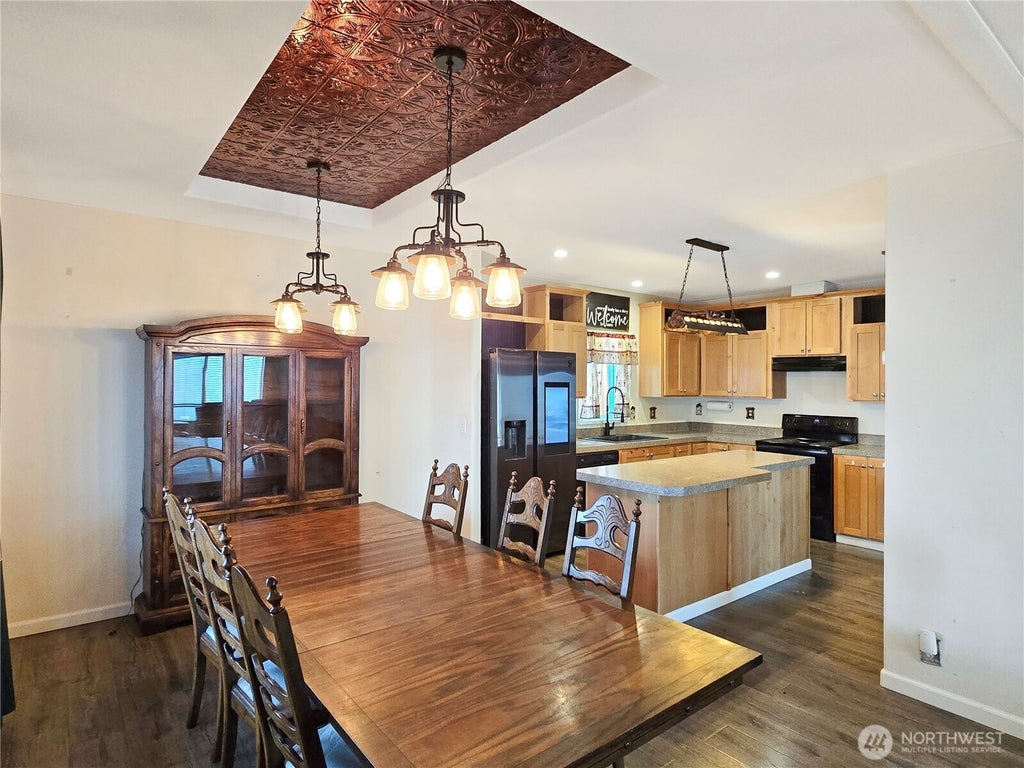 Welcome to the perfect blend of style & energy efficiency in this beautiful 2020 manufactured home located in an all-ages park! This thoughtfully designed 3-bed, 2-bath home features a spacious open-concept Kit, DR, and LR—ideal for hosting dinner parties & everyday living. You’ll love the modern black appliances, large center island, and recessed ceiling in the dining area that adds a touch of elegance. The interior showcases modern tape-and-texture walls, upgraded interior doors, upgraded insulation, hardwood-like laminate flooring, & custom valances. Enjoy covered parking and additional storage for your tools. This move-in-ready home is perfectly located near JBLM, shopping, schools, restaurants, parks, & more—Welcome Home!