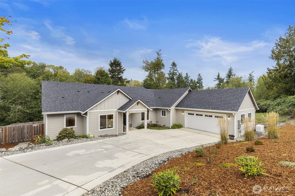 Modern living meets casual elegance in this immaculate, nearly new 3,100+ sq ft rambler tucked on 5 private acres. Open layout shines with hardwood floors, craftsman finishes, & a chef’s kitchen boasting granite island, propane cooktop, premium appliances, subway tile, & walk-in pantry. Entertain in formal & informal dining areas or relax by the fireplace & huge covered deck overlooking a private sanctuary. A spacious office, bonus room, oversized laundry, & smart appliances add comfort. Primary suite offers two large walk-ins. Garage w/ EV charging plus 1,800+ sq ft of full-height storage space complete this home. Just minutes from Kingston Ferry Terminal.Fiber Optic Internet w/ NET253. Starlink also available. Generator hardwired in too.