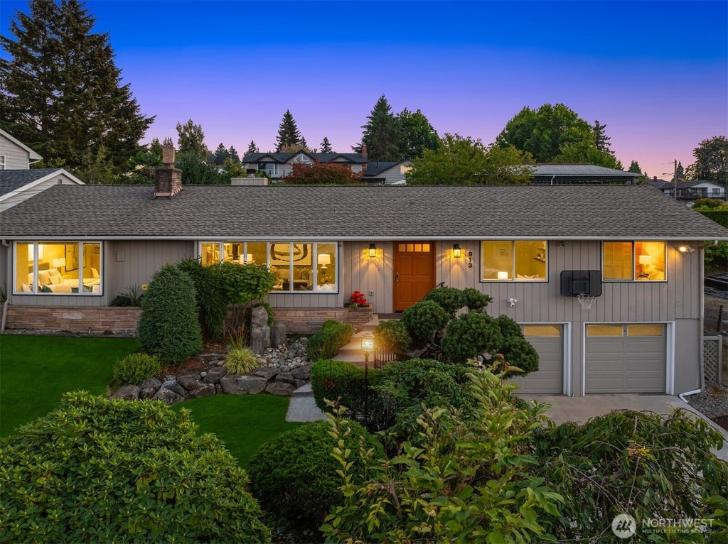 Sunlit rooms + generous spaces highlight this Kent mid-century charmer. Thoughtfully maintained landscaping adds to serenity of quiet residential neighborhood. Two fireplaces, hardwoods + French doors with beveled glass enhance home’s inviting character. Formal living + dining rooms. Spacious kitchen opens to great room + offers large island, cherry cabinets + bar area. Oversized laundry + bonus room that is perfect for home office. Ensuite bath off primary bedroom. Abundant storage throughout. Built-in vacuum system, surround sound speakers + new water heater. Backyard retreat is fully fenced with expansive brick patio + privacy hedges. 2-car garage + convenient to parks, schools, transit.