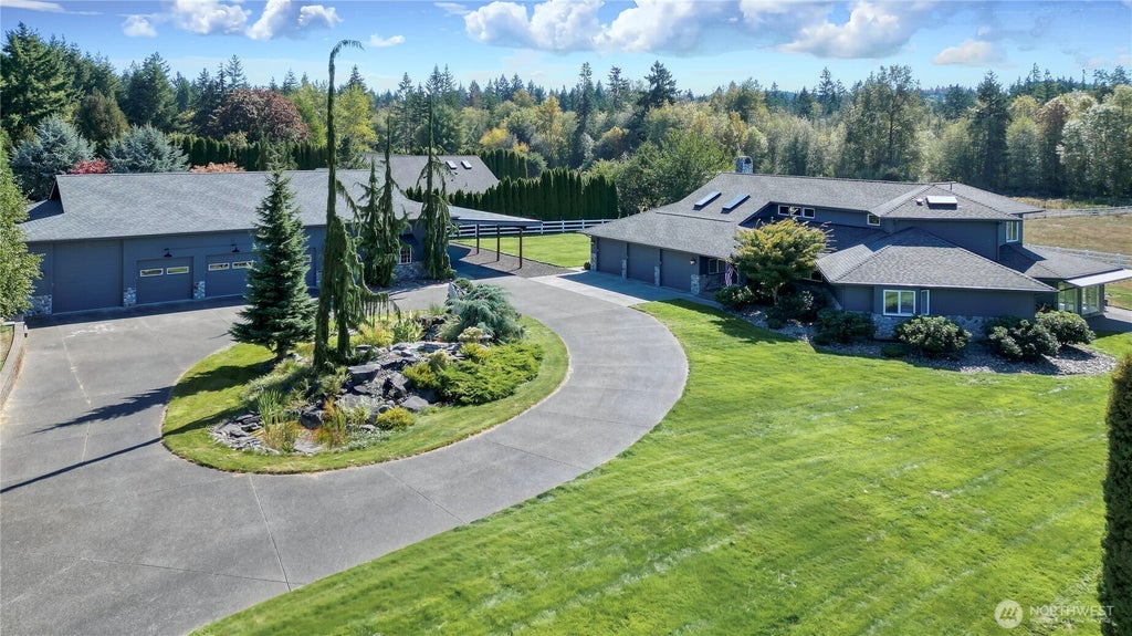 Stunning estate on nearly 5 acres off Fir Tree Rd in unincorporated Olympia! 3rd-owner Custom Home with Dream Shop, paved circle drive & 3-pond water feature. Inside: 2-story slate entry, Australian Cypress hardwood floors, soaring vaulted ceilings & exposed beam trusses. Chef-inspired kitchen w/slab granite, SS appliances, propane cooktop & walk-in pantry. Private primary suite w/FP & 2 WIC's. Full-length custom rear patio with cover & mister, property backs to Spurgeon Creek. Full-size Sport Court w/basketball hoops, chicken coop, irrigated & level acreage, vinyl split-rail fencing. No HOA! Ask your broker for Features/Updates & list of available items—rare lifestyle property combining luxury, recreation & privacy!