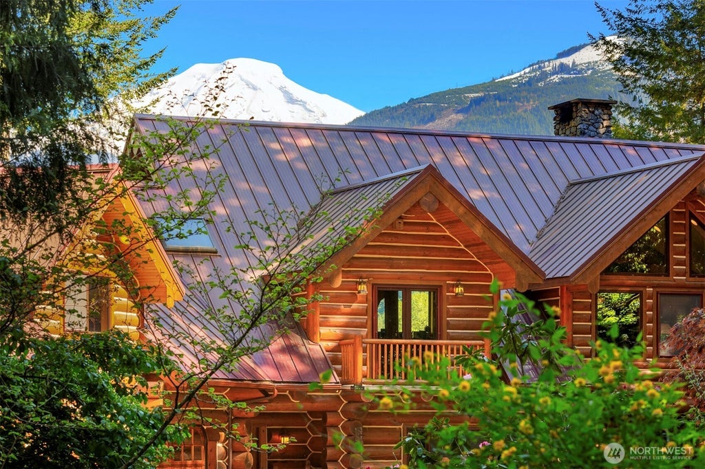 Embrace the grandeur of this Mt. Baker estate, boasting a mile of North Fork Nooksack River frontage across 15 acres. This majestic property offers an unparalleled après ski lifestyle with breathtaking panoramic views descending below the mountain range. The meticulously curated grounds feature serene waterfalls, meandering creeks, and tranquil ponds, crafting an exquisite year-round haven. Discover a true log estate crafted from the regions original fir logs to showcase exceptional artistry. The 30-foot vaulted ceilings create a grand ambiance, while a striking fireplace made entirely of local quarry limestone enhances the estate's elegance. This property is the epitome of refined living, blending natural beauty with sophisticated luxury.