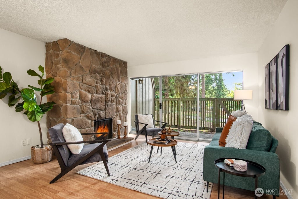 This charming ground-floor condo offers an ideal blend of comfort and character. You'll be greeted by a bright kitchen with a convenient pass through, allowing for a view to the living area and lovely breakfast bar. Centered in the living space is a gorgeous floor-to-ceiling, wood burning stone fireplace, perfect as a statement piece and a cozy necessity in cooler months. Right off the main area you will find a full bathroom which is functionally located between both generous sized bedrooms. Throughout the space, large windows invite natural light while the ground level location offers easy access. If you're looking for a quiet residence that is also steps away from major grocery stores, don't miss your chance!