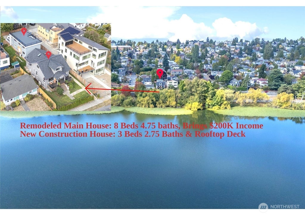 Live the dream in this Greenlake architectural masterpiece with sweeping lakeview!! This property can accommodate an owner occupied landlord or investor. Main house (6707 Aurora Ave N) is 3509 sf two story w/ basement, completely remodeled & fully furnished, operated as an AirBnB: Main Floor has 2 Bedrooms & 1.75 Bathrooms, 2nd Floor has 2 Bedrooms & 1 Bathrooms, and basement has 4 bedrooms & 2 bathrooms. Detached additional Dwelling (6709 Aurora Ave N) is a 2-story New Construction: 1380sf, 460sf attached garage and a huge rooftop lakeview deck, 3 bedrooms & 2.75 bathrooms. Excellent Schools!! Click 3D Tour of Main Home. The AirBnB of the Main House alone brings over $200K annual income!!