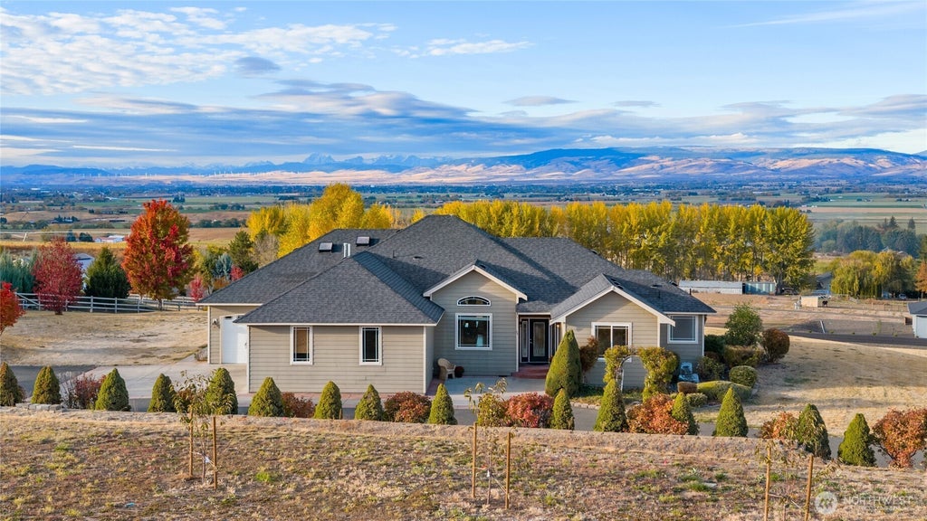 Perched on 3 acres overlooking the Kittitas Valley and the Stuart Mountain range, this beautiful home offers comfort, style, and space. The inviting living area features Brazilian cherry hardwood floors, a gas fireplace, and a coffered ceiling—perfect for cozy evenings or entertaining guests. The spacious kitchen is a cook’s dream with a breakfast bar, walk-in pantry, and sunny nook that captures the views. The primary suite is a private retreat, complete with a soaking tub, walk-in shower, and an expansive walk-in closet. Three nicely sized guest bedrooms. Enjoy outdoor living on the front and back patios—ideal for taking in sunsets or morning coffee. The attached 3-car garage provides plenty of space for vehicles and storage.